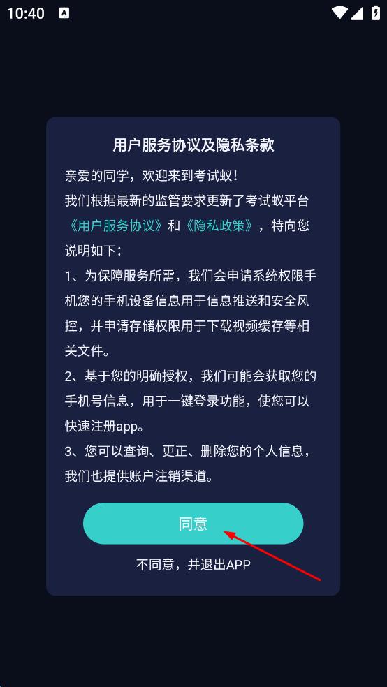 1、打开考试蚁APP,会弹出用户服务协议及隐私条款提示框,点击“同意”按钮。