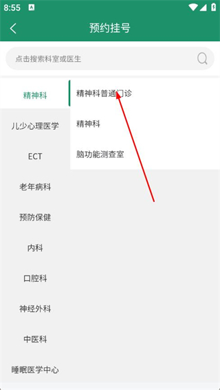 2、在预约挂号页面选择科室,如精神科普通门诊。