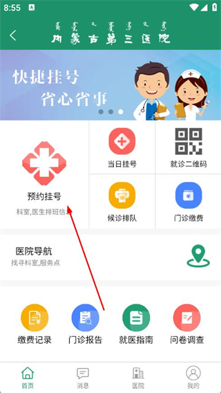 1、打开内蒙古第三医院APP,在首页点击预约挂号。