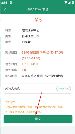 6、在预约挂号申请页面,确认信息无误后,点击提交。