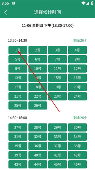 5、在选择候诊时间页面,选择具体的就诊号序。