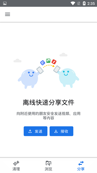 离线分享文件:可以将文件传输到附近好友的手机上。文件传输经过加密,不但速度飞快,还不会消耗任何数据流量