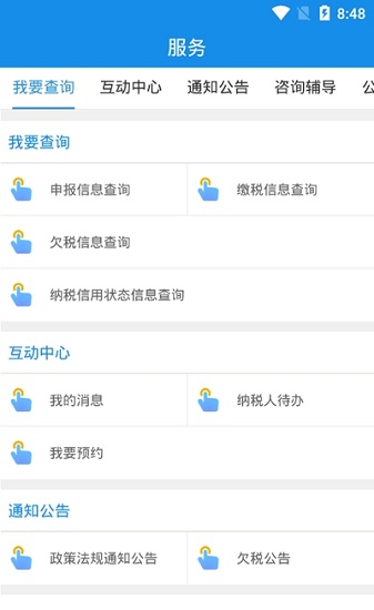 【服务】界面的功能主要是“我要查询”、“互动中心”、“通知公告”、“咨询辅导”和“公众查询”。主要用于纳税人查询本企业的基础涉税信息、查看最新税收政策、办税日历、办税地图及其它常用的公众查询功能。
