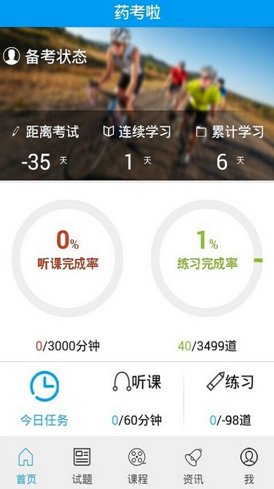 4、学习管理:药考啦会每天更新考试剩余时间,连续学习的天数以及累计学习的天数;
