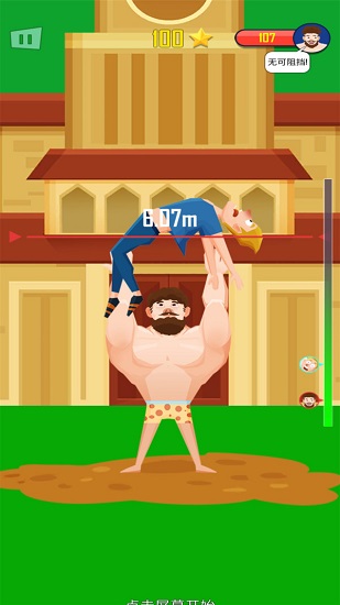 1、简单的游戏玩法,点击大力士怀中的男人,可以抛向天空。