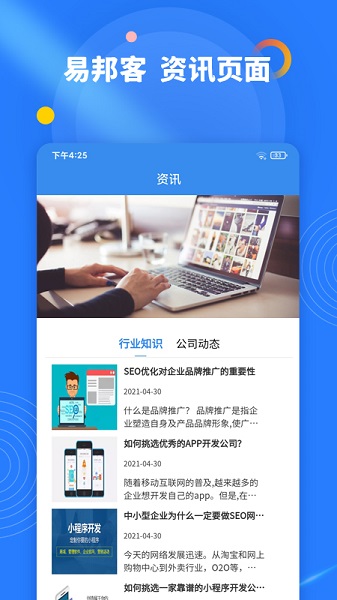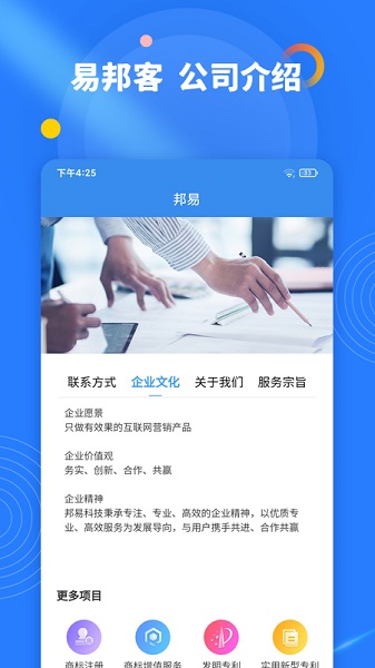 易邦客是西安邦易网络科技有限公司为合作企业定制的一个展示、交流、协作的平台,