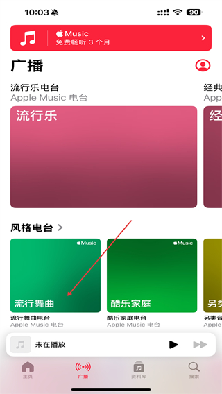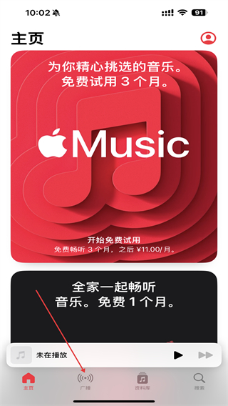 1、启动苹果音乐APP,进入主页内点击下方广播的图标。