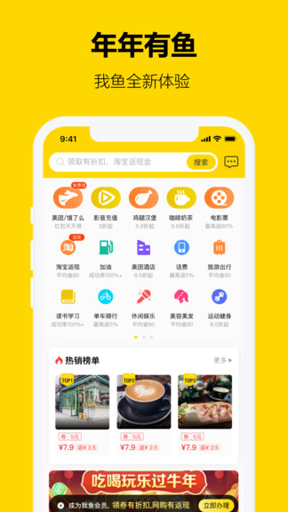 我鱼是一款非常全面的手机购物app,这里有生活中所需要用到的大量的商品,外卖、电影票、酒店、淘宝购物、加油、读书、娱乐、旅游、话费、美容、健身等等等等非常全面,一站式的购物体验,让用户感到非常的方便,还有大量的又换券可以让用户购物的更加的省钱。