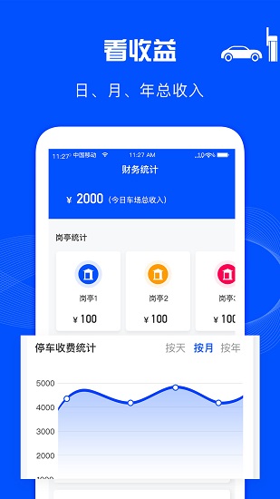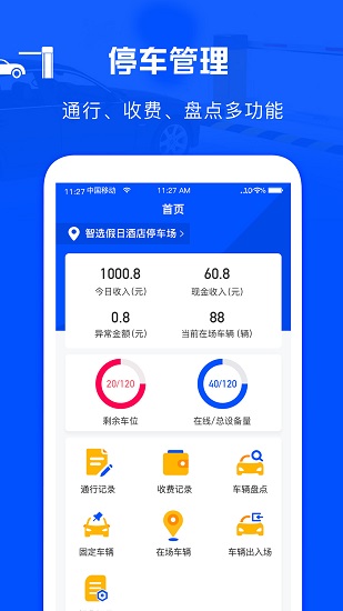 可以随时查看每日收入、停车数量,还有剩余车位等信息;