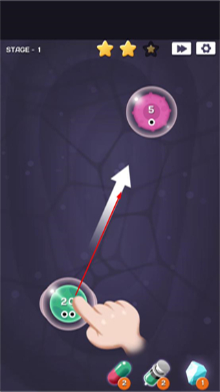 1、进入游戏第1关,按照提示拖动绿色细胞,使其与粉色细胞进行合成操作。