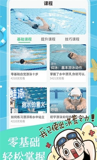 飞鱼游泳教学app是一款好用的游泳教学平台,汇集了多种游泳视频可以选择学习,多种游泳姿势可以选择,专业的教练为你授课,轻松掌握各种泳姿,学会游泳不仅可以求生还可以减肥,掌握学习方法,零基础也能轻松掌握。