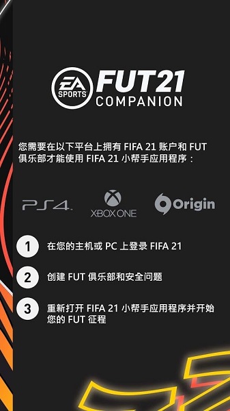 3、在您的兼容移动设备上通过FIFA21小帮手应用程序登录您的EA账户