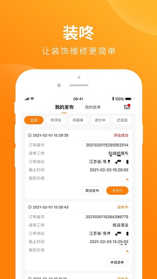 装咚app专门为有装修需要的用户提供装修服务,自己家里需要翻新或者新房装修,可以直接手机在线发布订单,装修师傅可以通过这个平台查看详细的订单信息,然后就会有装修公司联系你,为你制定一些装修方案,然后你只需要自己选择合适的,装修公司就会完成相应的工作。装修订单情况可以实时的查看,只要完成就可以获得收益。
