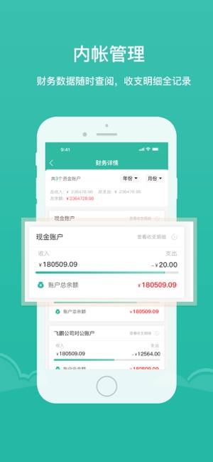6、财务报表自动生成,每个人可以在此同时管理多个资金账户并且可以随时查看财务详情;