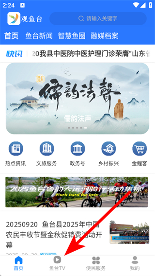 1、打开鱼台融媒app,点击底部鱼台TV,进入鱼台TV页面。