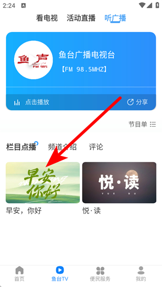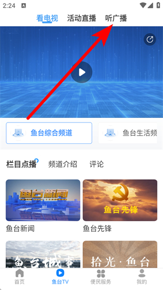 2、在鱼台TV的页面,需要点击听广播按钮,进入广播板块。