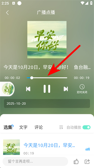 4、在广播点播页面,可通过进度条调节播放进度,或设置定时关闭等。