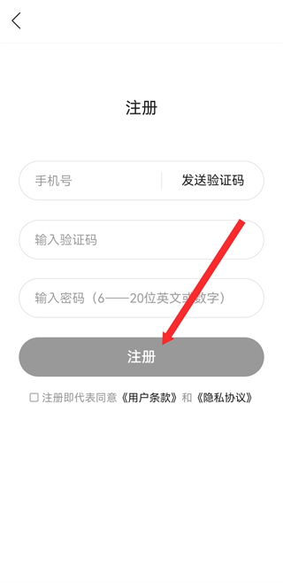 4、在注册的页面,输入手机号码和验证码后,点击注册。