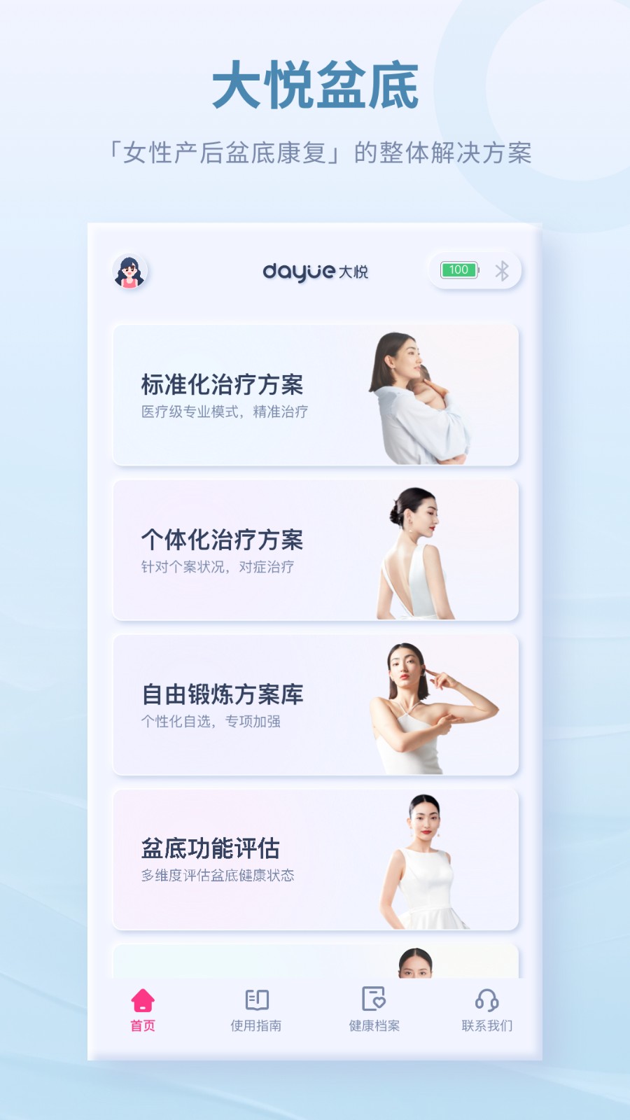 大悦盆底是一款配合盆底康复治疗仪使用的专业级家用型盆底康复治疗APP ,具有标准评估、产后盆底功能康复、治疗压力性尿失禁及女性功能补偿等功能。