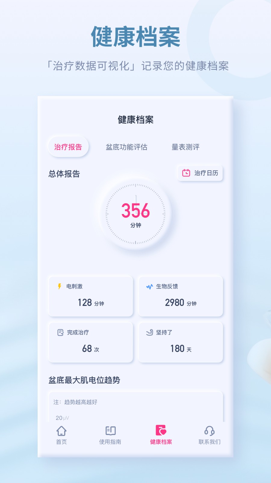 大悦盆底app全面展示用户的治疗数据和记录。治疗历程和成果,一目了然。