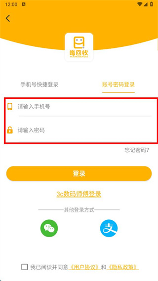 1、在嗨回收app登录页面,点击账号密码登录,切换至账号密码登录模式。