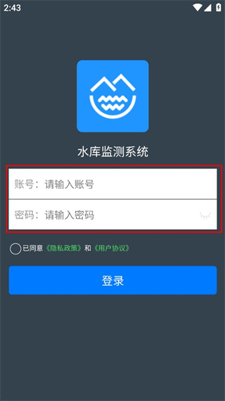 1、打开水库监测系统APP,在隐私政策和服务协议弹窗中点击“同意”。