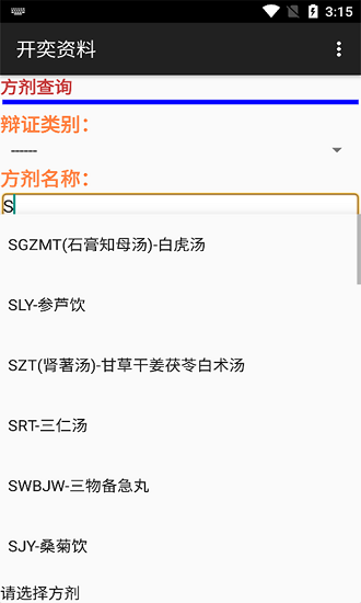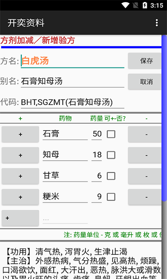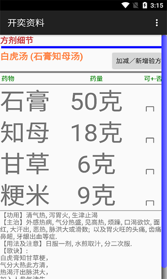 软件上对于每一种不同的方剂都有着非常丰富的介绍,包括各种配方和不同的名称以及数量,完整的展示给用户,帮助用户对于不同的方剂有一个全面的认知。