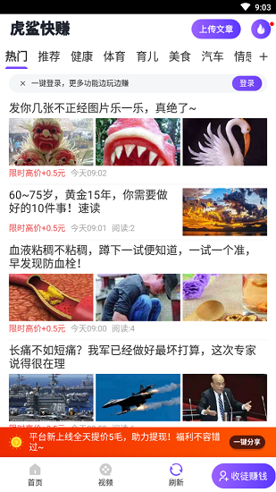 虎鲨快赚是一款看文章赚钱的app,你在这里只需要看文章,然后转发出去就可以赚钱,而且平台有大量的优质的文章可以看,平时没事的时候可以看看打发时间,你还在等什么呢,快点来下载体验吧!