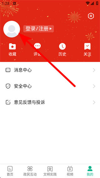 2、在个人页面,点击头像区域的登录/注册选项,进入账号登录界面。