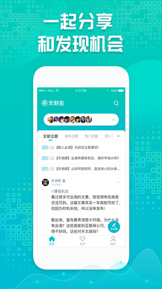 3、可把项目,经验通过主题方式分享天财会上,让大家进行互动,互相发表意见和建议。
