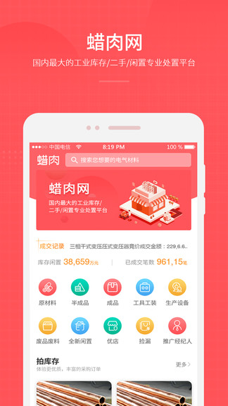 蜡肉最新版是一款专门通过拍卖的方式出售大量的二手工业库存的软件。卖家可以直接申请商铺轻松入驻,在拍卖的时候由买家制定底价,买家竞拍并且成交后不会收取买家任何手续费,让工业库存体验出应有的价值。