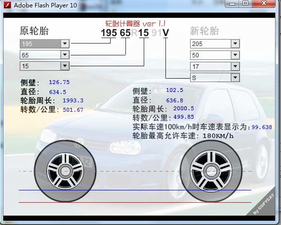 轮胎计算器是一个使用方便的汽车轮胎改装的计算工具,本版本为flash版本直接桌面运行计算,它可以在线模拟不同参数的轮胎改装时的效果,可计算新车轮导致显示车速比真实车速快多少公里/小时,计算数据仅供参考,是方便车主改装换胎的好帮手。
