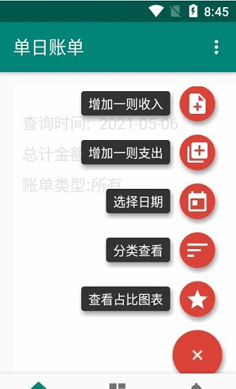 1、在这里可以随时添加每日的账单消费,并且可以进行收入、支出分类记账;