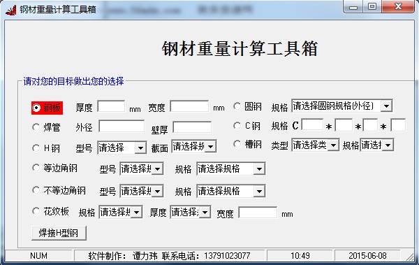 钢材重量计算工具箱是一款非常实用的钢材重量计算器,使用该工具可以帮助用户快捷的计算出各种钢材消耗情况,既不用查阅手册也不用纠结于繁琐的计算公式,大大的提高了计算的效率,欢迎下载使用。