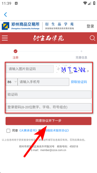 3、在注册信息填写的页面,输入信息后点击同意协议并下一步。