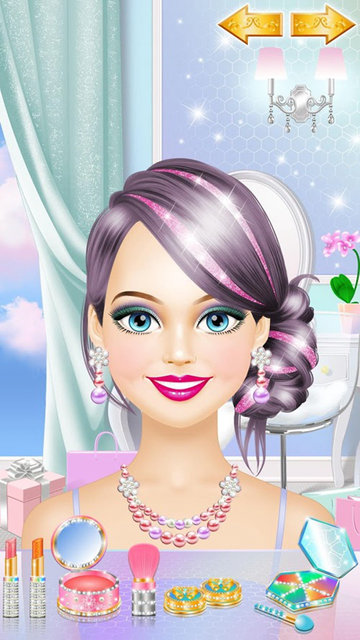 ※时尚女孩喜欢化妆和珠宝。这就是你接下来在化妆沙龙里要做的。看看我们有那么多色彩鲜艳的化妆品!从亮粉色到哑光红色,再到有莱茵石的脸部彩绘,你一定会为她选择最漂亮的妆容!