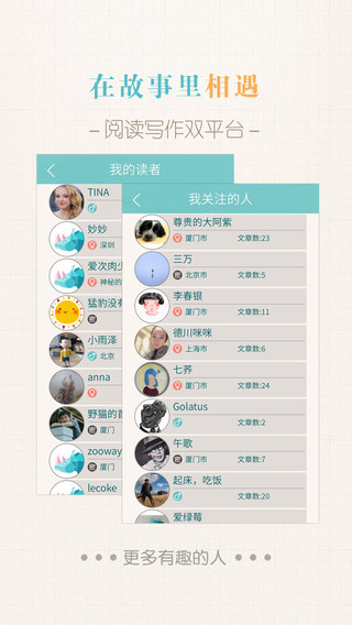 精美专业:编辑团队全部由专业编辑,已出版著作的作家和画家担任,精耕细作每一帧图文的位置和质感,精彩故事将由插画团队制作插画。呈现的内容能丰富用户的灵感和生活,并帮助用户找到最忠诚细致的分享者。