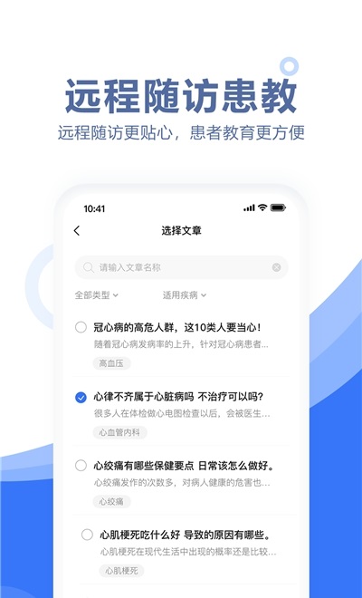 3、远程教育,健康知识,用户可以通过软件中发布的各种优质健康资讯文章来为患者服务,将各种优质文章直接发送,提高患者健康意识。