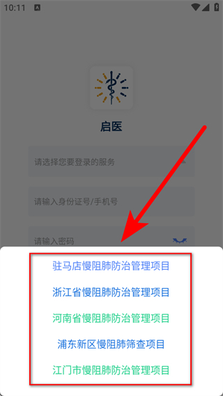 3、选择对应管理项目如驻马店慢阻肺项目,确定服务类型。
