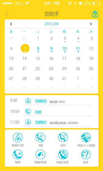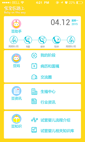 宝宝在路上是一款移动端的生育服务app。软件的核心功能是豆助手。通过智能化的界面,让用户可以把医生的要求记录保存,清晰知道自己需要主动做什么,配合医生做什么,精确到具体的时间点等,据此用户能马上了解自己所处的治疗阶段。所有记录备份在云端,并自动生成“病历本”,方便用户查阅。试管婴儿的成功率并非百分之百,每个医生都在努力为患者争取更大的机会。医患目标一致,更利于治疗取得好的效果。因此,用“豆助手”功能管理自己的周期不单是实现自我管理,也实现医患之间在治疗中的完美配合。