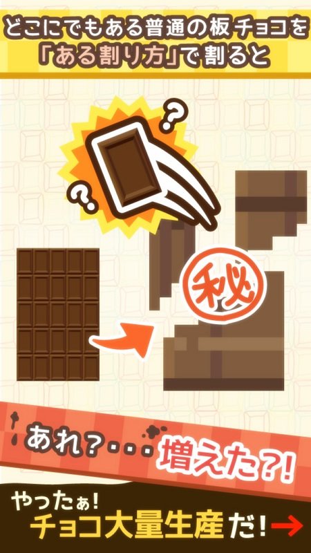 游戏中玩家需要把巧克力按照某种特定的方法切割,就能得到多出来的一块巧克力?!不断切割创作无穷无尽的巧克力吧!