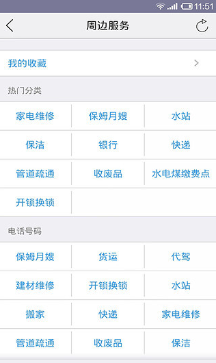 6、小区业主可以通过本应用的周边服务查询到周边类似保姆月嫂、代驾、管道疏通、医院等相关的服务电话。