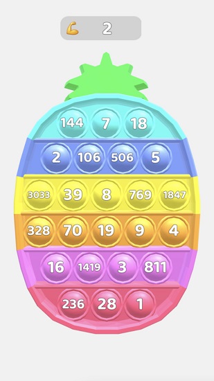 1、一个像菠萝一样的图案,这里面有很多不同颜色数字球球,叠加它们,可以将其全部弹出去。