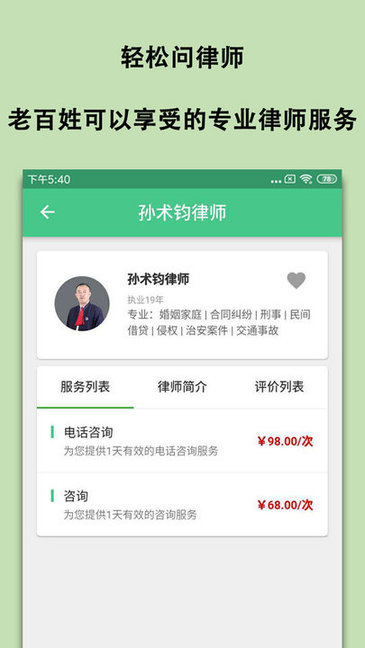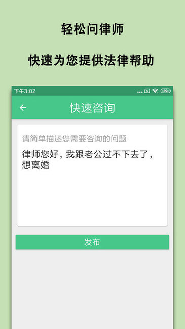 用户下单并先向轻松问律师App付款,公司保证服务。在律师服务结束并且用户满意之后,费用将发送到律师应用程序帐户。保护用户的经济利益免受不必要的损失。
