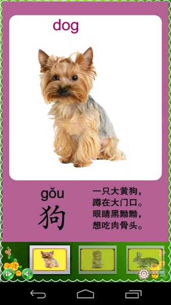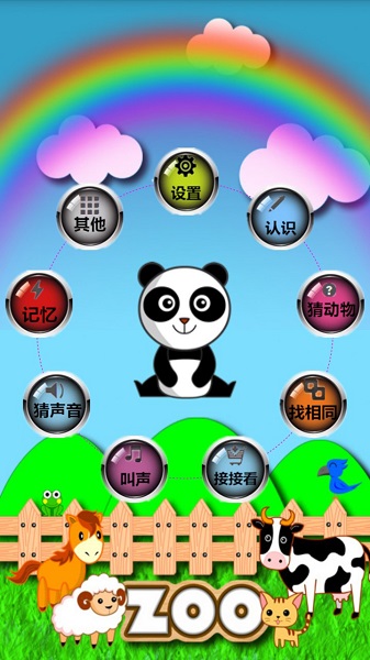 4、认识:通过高清图卡认识各种动物,中文和英文童声朗读功能,帮助学说话,在主页“设置”里更改;