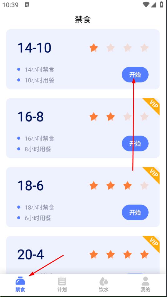 1、打开断食应用,进入禁食模式选择页面,选择合适的禁食计划,点击开始按钮。