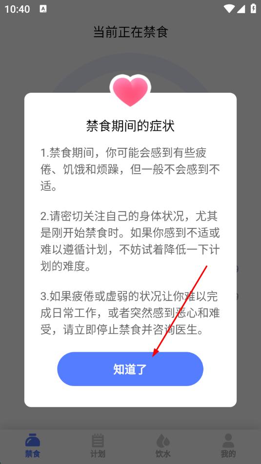 4、弹出关于禁食期间症状的提示弹窗,阅读了解相关信息后,点击知道了。