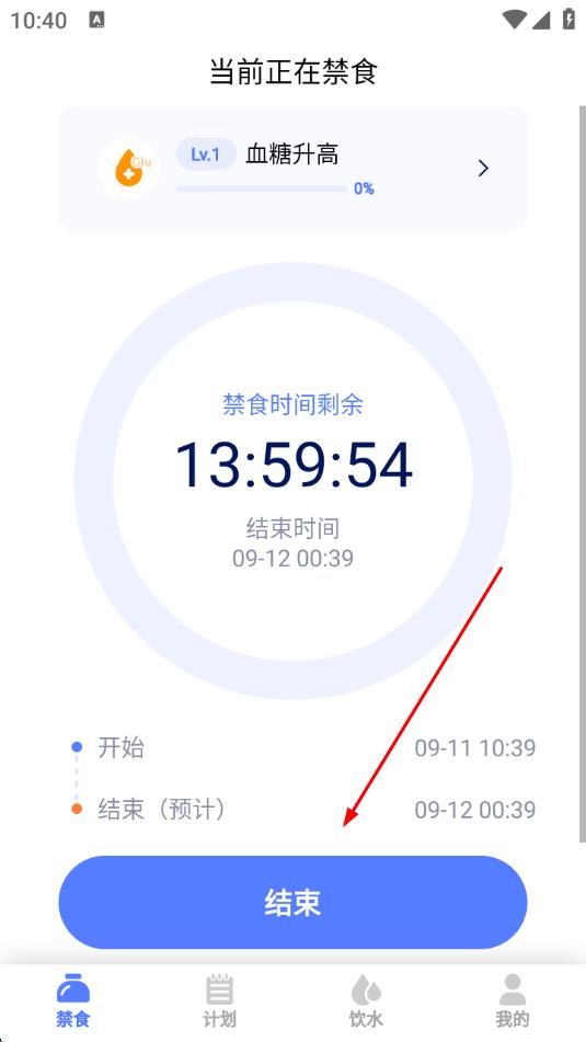 3、进入禁食计时页面,可看到禁食剩余时间和预计结束时间,如果想提前结束禁食,点击结束按钮。
