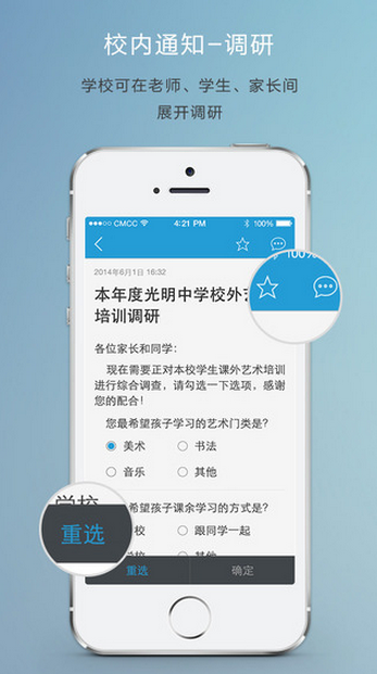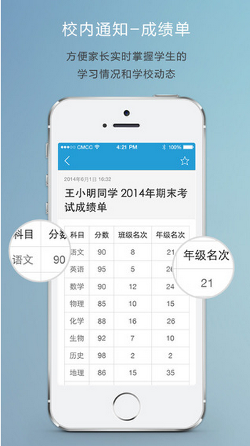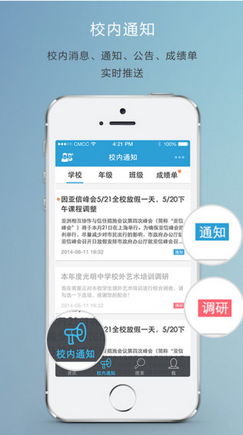 3、实时推送和接收新闻、校讯、作业、调查、考试成绩、招生等多种内容形式的多媒体信息和通知。