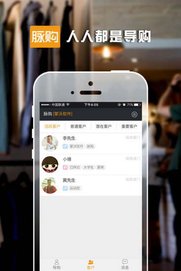 通过脉购App,导购员可随时与商家的微信公众号粉丝进行聊天互动,并进行产品的推广和销售。